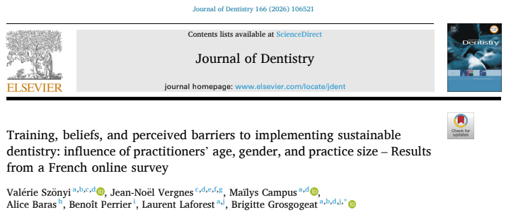 Nous sommes heureux d’annoncer la parution de notre article “Training, beliefs, and perceived barriers to implementing sustainable dentistry: influence of practitioners’ age, gender, and practice size – Results from a French online survey” dans le @Journal of Dentistry!